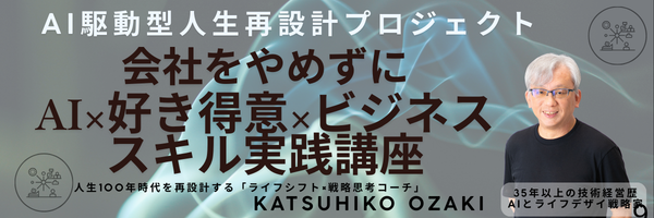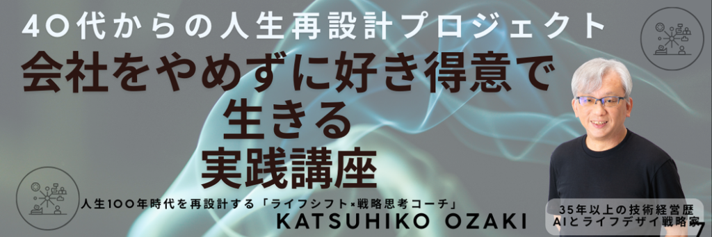 Home 【40代からの人生再構築プロジェクト】・6ヶ月コース(1on1個別コンサル初回2回+期間内無制限質問+月1回1Hrグルコン+動画コンテンツ)・会員サロン参加可能・498,000円(税込) 無料個別相談会に申し込む! 講師:尾崎 勝彦(ライフシフト戦略家・フューチャーマッピング認定コーチ) 元神戸製鋼所開発企画部担当部長/35年勤務、エンジニア、戦略企画、新事業立ち上げまで経験 社長賞4回、精密工学会受賞 MBA・工学博士号取得/神田昌典氏 認定コーチ DMM AI CAMP認定 AIエンジニア 読書会100回以上開催、読書500冊超 60歳で独立後、初年度から安定収入を実現 現在は中小企業支援・ライフデザイン支援を中心に活動 「人生100年時代の後半を、どう生きるか。」 その問いに、真剣に向き合うあなたを全力でサポートします。 【ライフシフト実践講座】・6ヶ月コース(1on1個別コンサル月2回1Hr+コンテンツ)・無料個別相談会を活用ください 無料個別相談会に申し込む! さあ、歩みだそう 今あるもの全てが我々を支えてくれる 未来に橋をかけるための準備を始めよう! 【40代からの人生再構築プロジェクト】・6ヶ月コース(1on1個別コンサル初回2回+期間内無制限質問+月1回1Hrグルコン+動画コンテンツ)・会員サロン参加可能・498,000円(税込) 無料個別相談会に申し込む! プライバシーポリシー 特定商取引法